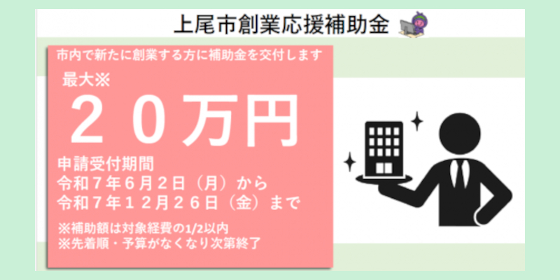 上尾市内で新たに創業する市民を対象に、その創業にかかる経費の一部を補助します。第二創業や事業承継を予定している人も対象になります。
