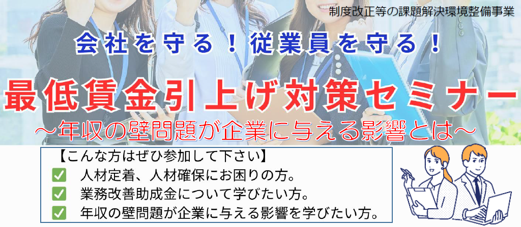 昨年も最低賃金の引上げがあり、中小・小規模事業者を取り巻く雇用環境は一段と厳しい状況にございます。本セミナーでは、このような環境下で活用できる「業務改善助成金」について解説いたします。また最低賃金引上げに合せて、社会保険制度に関するパート従業員等の「年収の壁」問題の影響についても解説いたします。人手不足でお悩みの事業者様はこの機会にぜひご参加ください。