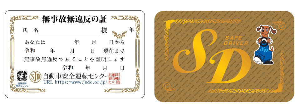 ➤ 「無事故・無違反証明書」又は「運転記録証明書」を申請された方で、1年以上事故・違反等の記録がない方に、安全運転者(Safe・Driver)の証しとしてお渡しするカードです。